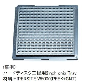 特にPEEK材料(HIPERSITE W5000)を使用した製品(例:チップトレイ)は樹脂温度・金型温度も高温で、且つ結晶性樹脂であるため収縮率が非常に大きい為、 反り変形を起こし易く、平面度をコントロールする事は非常に難しい製品です。