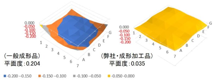 当社では、平面度をクリアする為に、CAE解析を用いて製品形状の最適設計と金型設計及び成形加工技術を確立する事により、量産時の厳密な生産管理のもと、顧客要求の平面度(反り)を達成し長年にわたり製品供給しています。詳しくはお問い合わせ下さい。