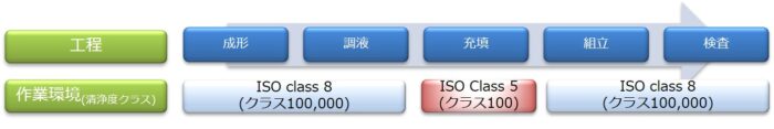 成形から検査までの全ての工程をクリーンルーム内で行っており、特別な管理が必要な充填工程ではクラス100以下の環境で作業をしています。また、クリーンな環境に加え、無菌性にも配慮しており、寒天培地を使用して日々確認を行っています。